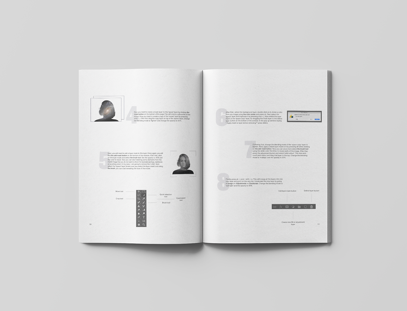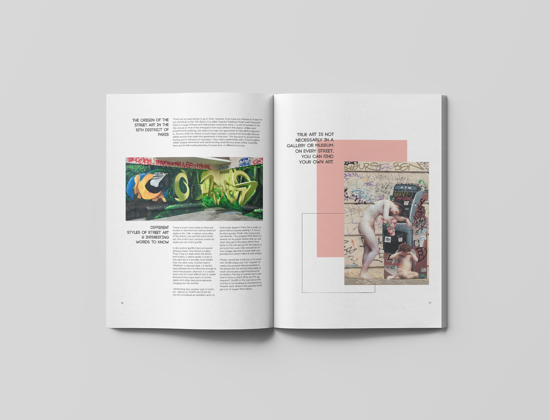 GIVE ME SPACE is a magazine that I created together with four other students as a group project in university. We aimed to create a minimalistic visual with cleverly used white space. Some pages that I designed about street art in Paris.